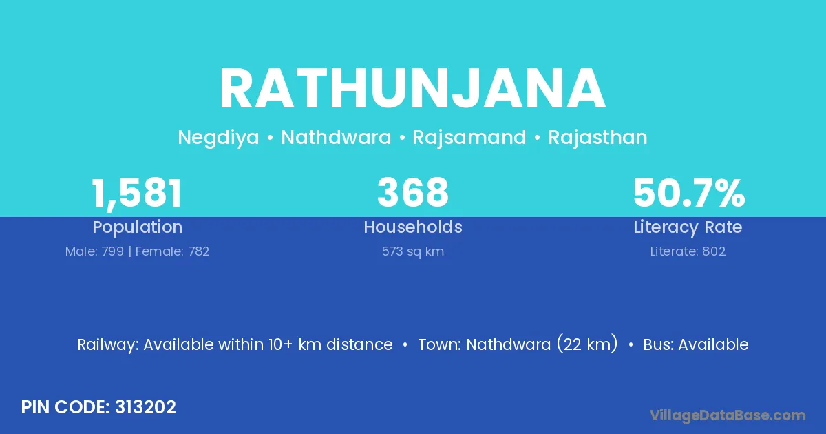 Nathdwara (22 km) is the nearest town to Rathunjana village for major economic activities and is located approximately 22 km away.