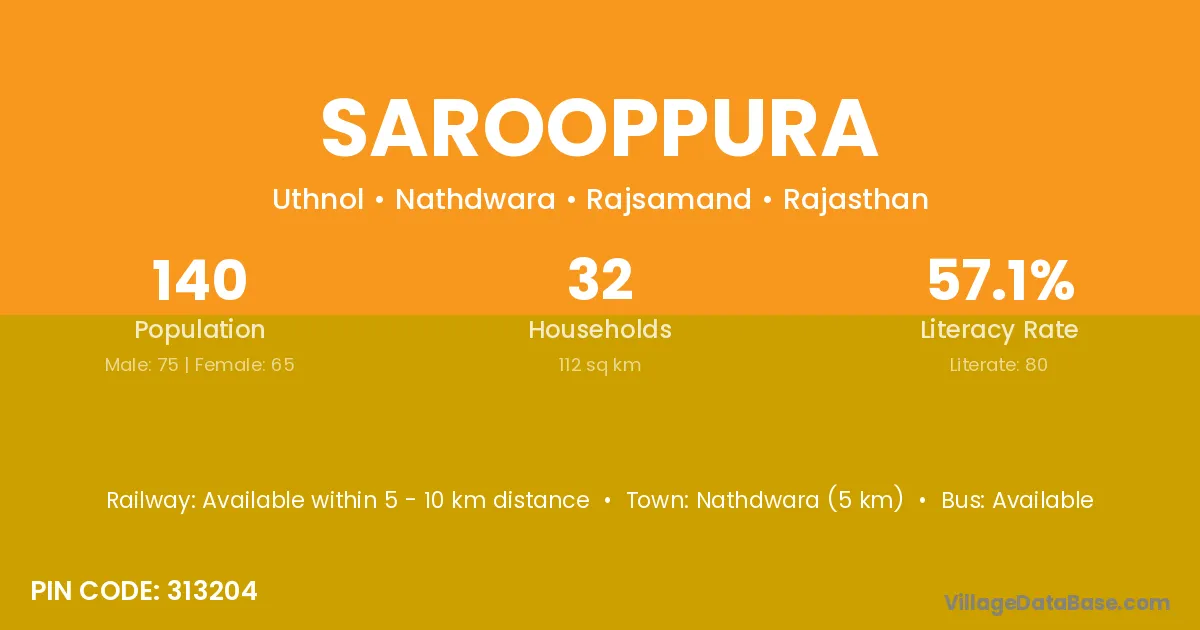 Nathdwara (5 km) is the nearest town to Sarooppura village for major economic activities and is located approximately 5 km away.
