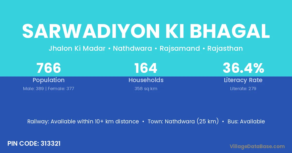 Sarwadiyon Ki Bhagal village has a total population of 766 people, of which 389 are males and 377 are females.