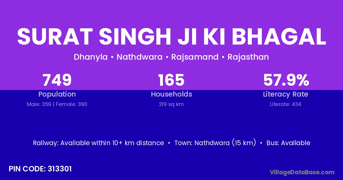 Surat Singh Ji Ki Bhagal village has a total population of 749 people, of which 359 are males and 390 are females.