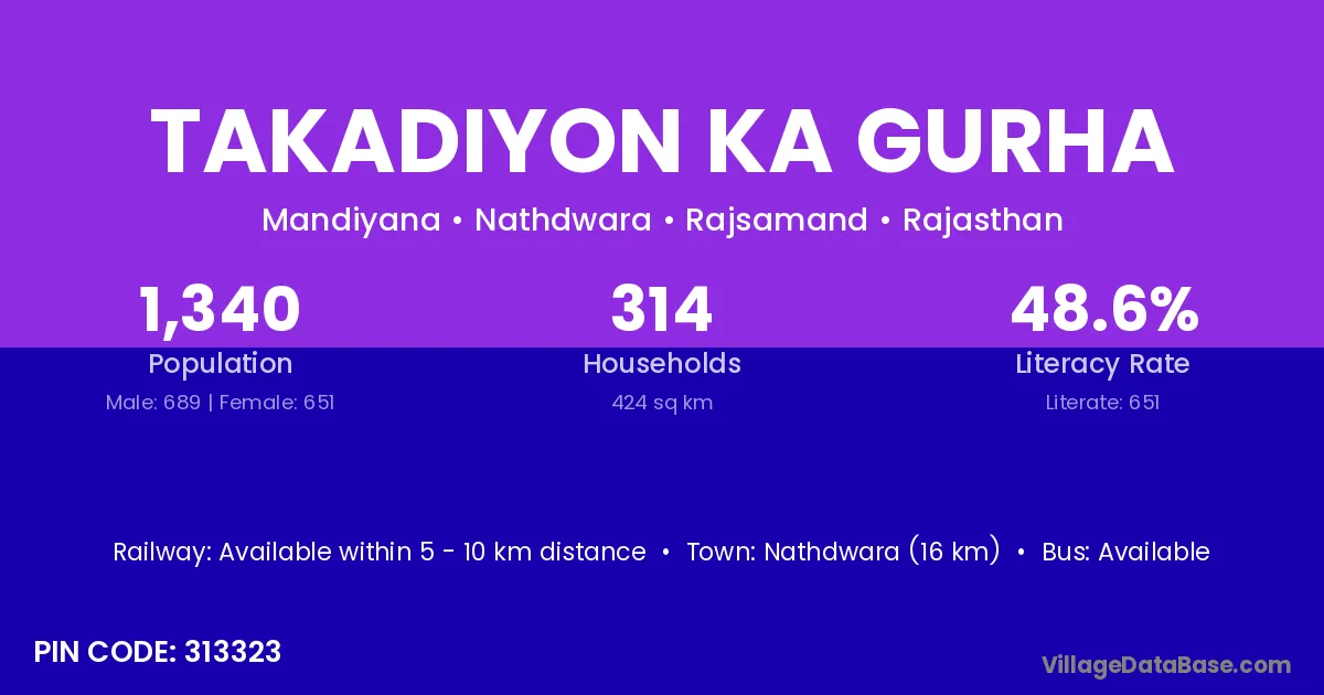 Takadiyon Ka Gurha village has a total population of 1,340 people, of which 689 are males and 651 are females.