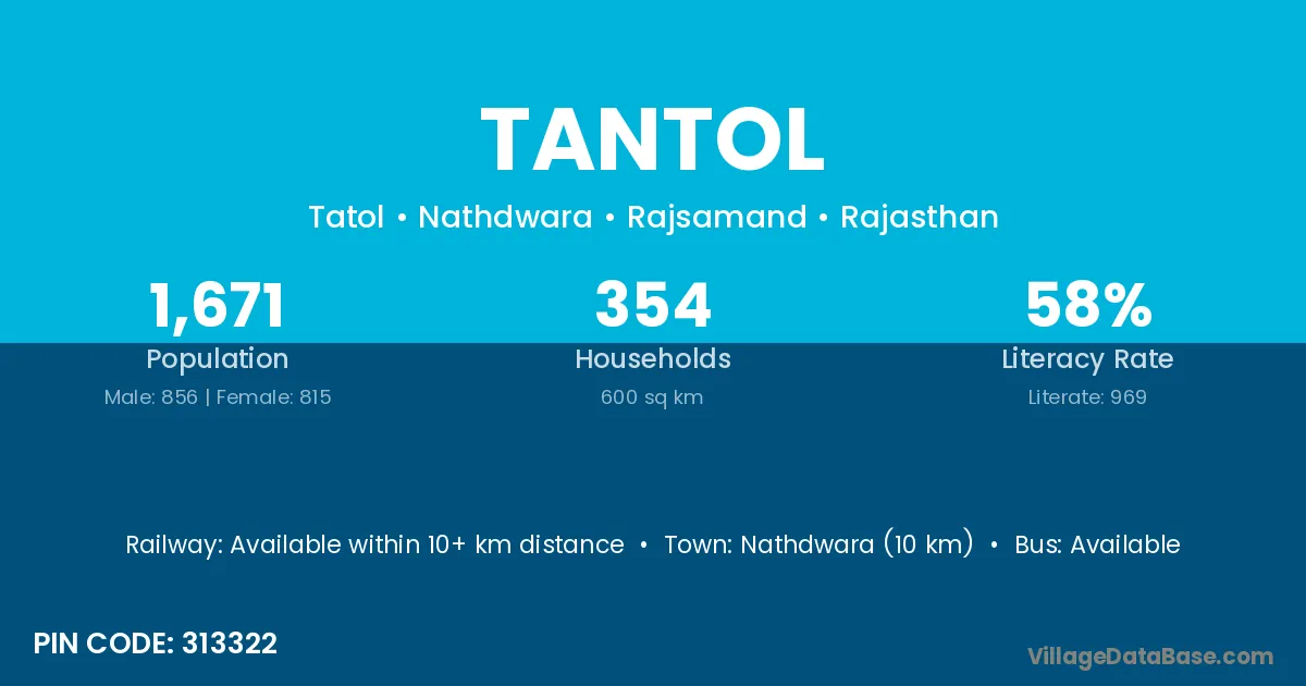 Nathdwara (10 km) is the nearest town to Tantol village for major economic activities and is located approximately 10 km away.