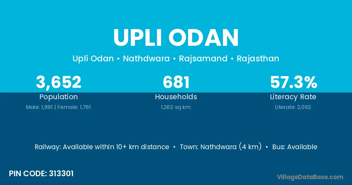 Nathdwara (4 km) is the nearest town to Upli Odan village for major economic activities and is located approximately 4 km away.