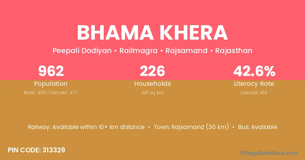 Rajsamand (30 km) is the nearest town to Bhama Khera village for major economic activities and is located approximately 30 km away.