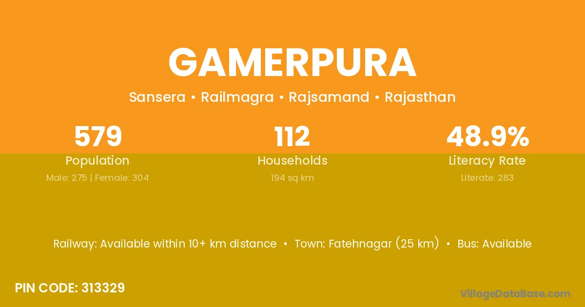 Fatehnagar (25 km) is the nearest town to Gamerpura village for major economic activities and is located approximately 25 km away.