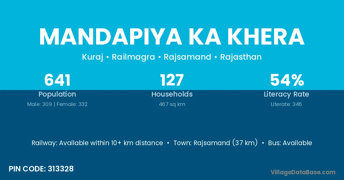 Rajsamand (37 km) is the nearest town to Mandapiya Ka Khera village for major economic activities and is located approximately 37 km away.