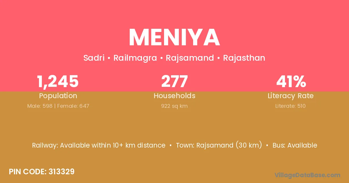Rajsamand (30 km) is the nearest town to Meniya village for major economic activities and is located approximately 30 km away.