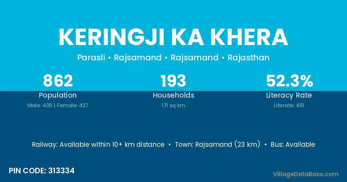 Rajsamand (23 km) is the nearest town to Keringji Ka Khera village for major economic activities and is located approximately 23 km away.