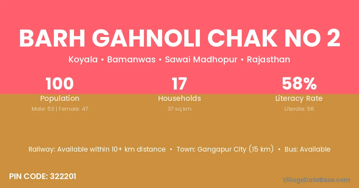 Barh Gahnoli Chak No 2 village has a total population of 100 people, of which 53 are males and 47 are females.