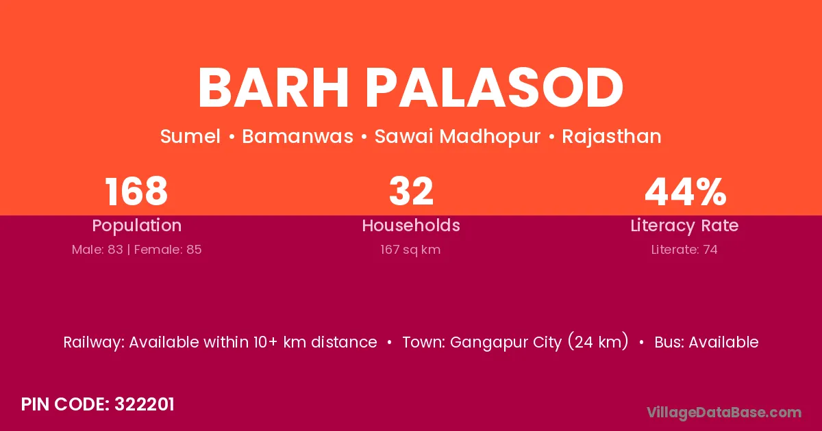 Gangapur City (24 km) is the nearest town to Barh Palasod village for major economic activities and is located approximately 24 km away.