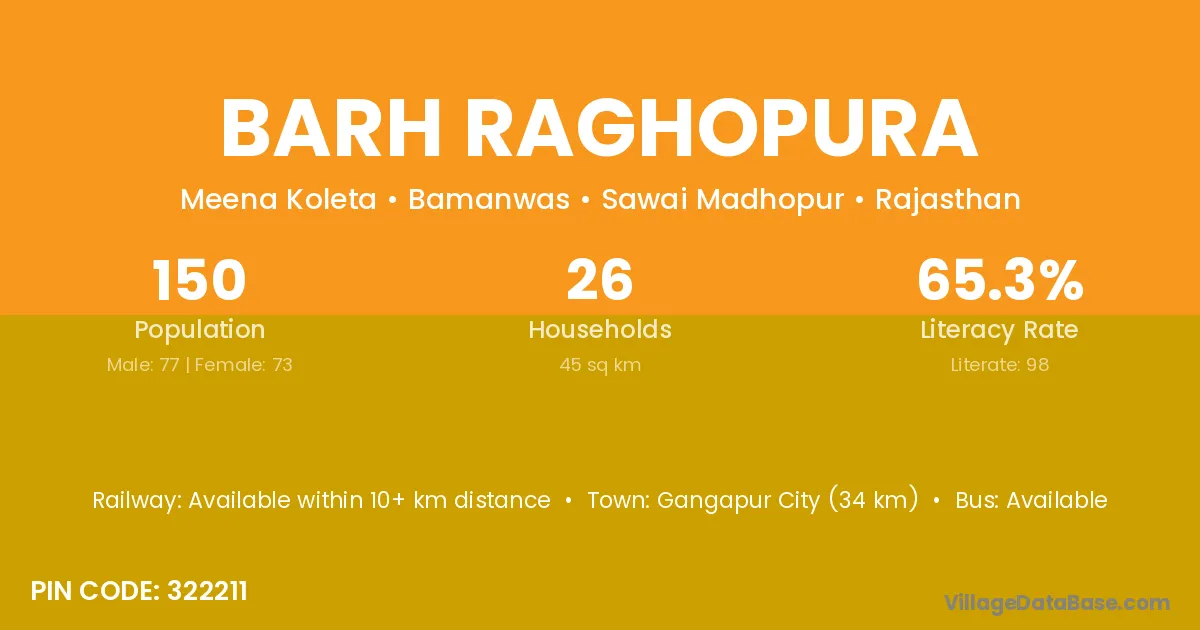 Gangapur City (34 km) is the nearest town to Barh Raghopura village for major economic activities and is located approximately 34 km away.