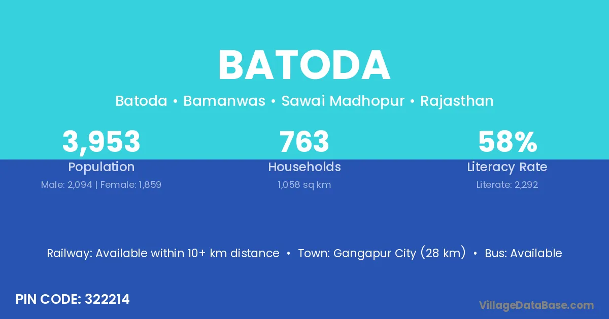 Gangapur City (28 km) is the nearest town to Batoda village for major economic activities and is located approximately 28 km away.