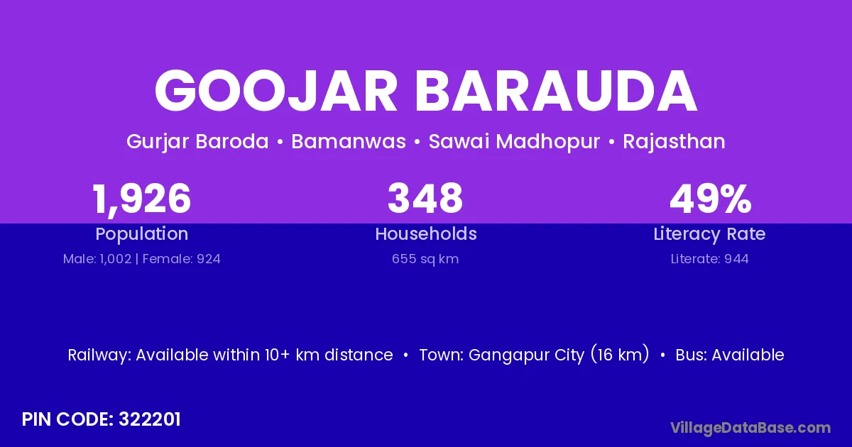 Gangapur City (16 km) is the nearest town to Goojar Barauda village for major economic activities and is located approximately 16 km away.