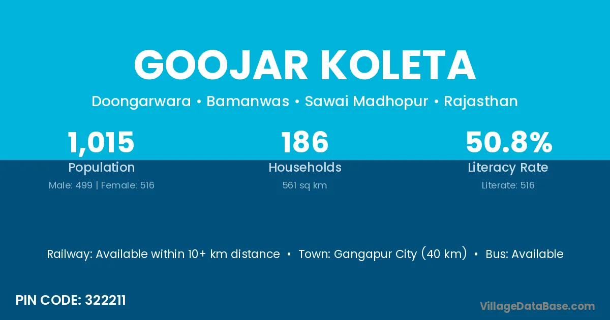 Goojar Koleta village has a total population of 1,015 people, of which 499 are males and 516 are females.
