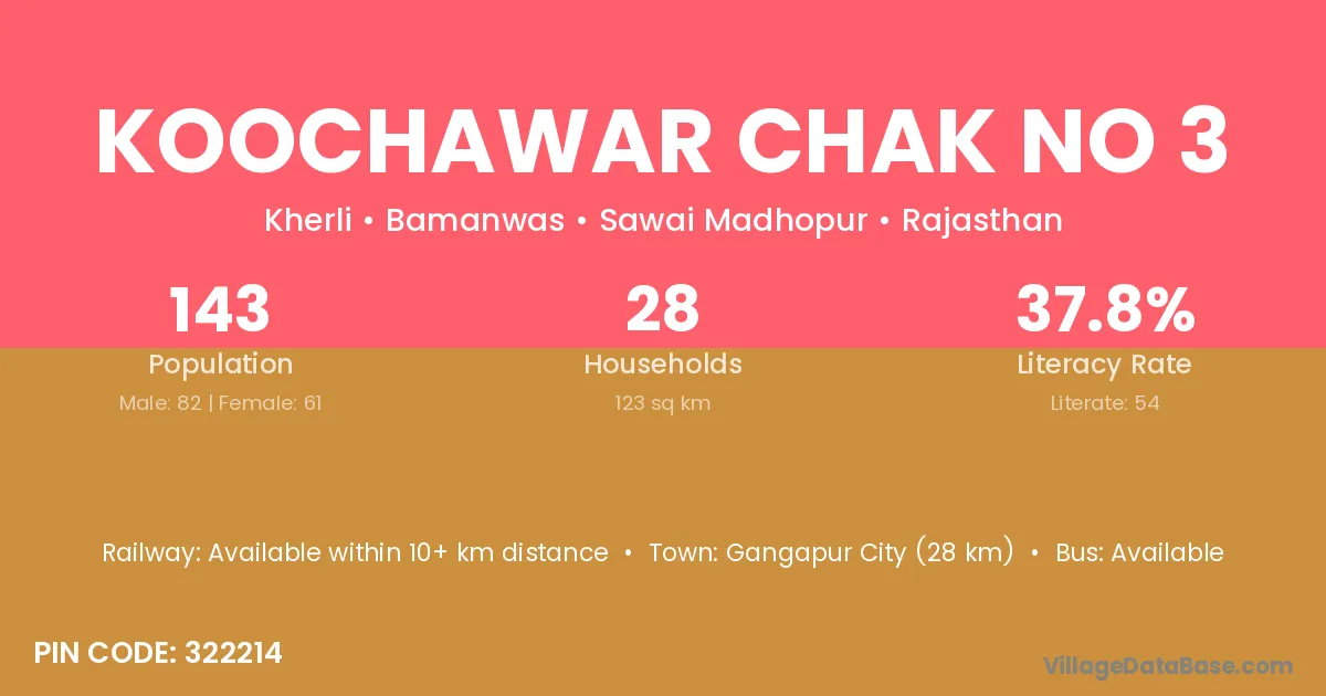 Gangapur City (28 km) is the nearest town to Koochawar Chak No 3 village for major economic activities and is located approximately 28 km away.
