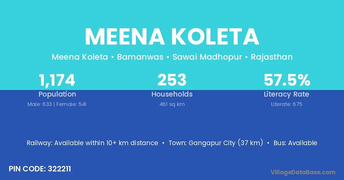 Gangapur City (37 km) is the nearest town to Meena Koleta village for major economic activities and is located approximately 37 km away.