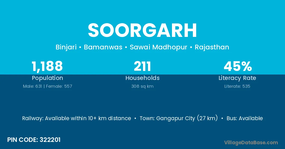Gangapur City (27 km) is the nearest town to Soorgarh village for major economic activities and is located approximately 27 km away.