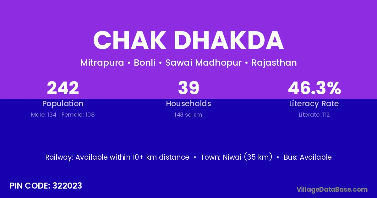 Niwai (35 km) is the nearest town to Chak Dhakda village for major economic activities and is located approximately 35 km away.