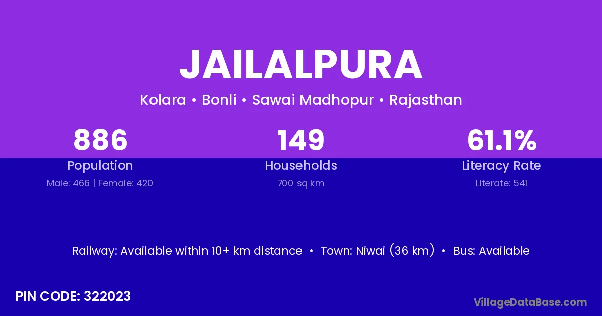 Niwai (36 km) is the nearest town to Jailalpura village for major economic activities and is located approximately 36 km away.