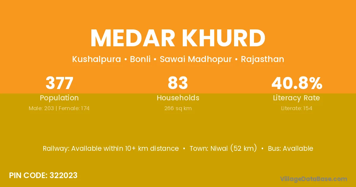Niwai (52 km) is the nearest town to Medar Khurd village for major economic activities and is located approximately 52 km away.