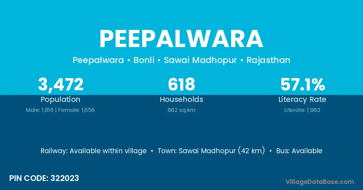 Sawai Madhopur (42 km) is the nearest town to Peepalwara village for major economic activities and is located approximately 42 km away.