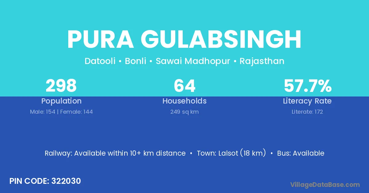 Lalsot (18 km) is the nearest town to Pura Gulabsingh village for major economic activities and is located approximately 18 km away.