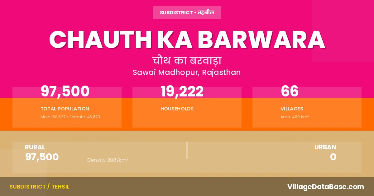 According to the 2011 census The total area of Chauth Ka Barwara Tehsil is 469 km², with a population of 97500 people. The population density is 208 inhabitants per square kilometre, and there are approximately 19222 houses in the sub district.