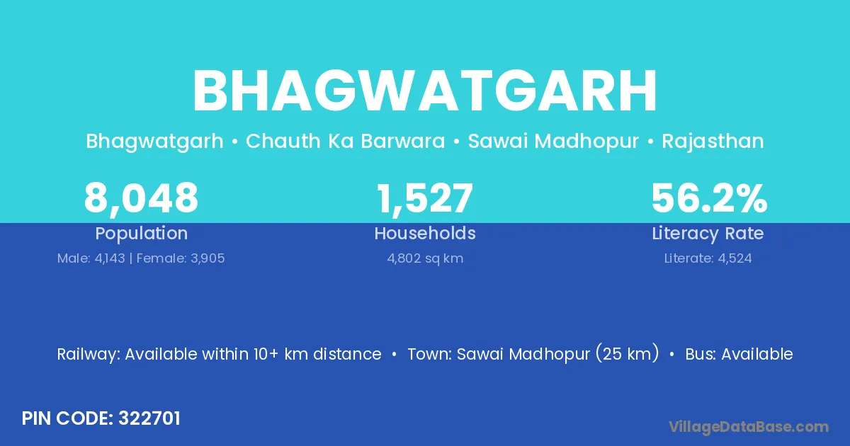Sawai Madhopur (25 km) is the nearest town to Bhagwatgarh village for major economic activities and is located approximately 25 km away.