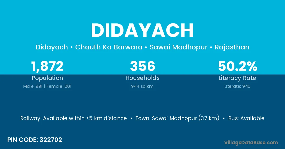 Sawai Madhopur (37 km) is the nearest town to Didayach village for major economic activities and is located approximately 37 km away.