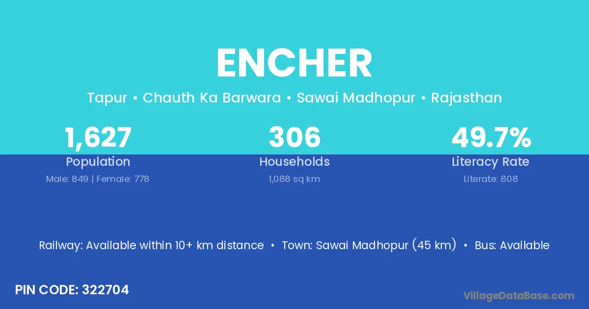 Sawai Madhopur (45 km) is the nearest town to Encher village for major economic activities and is located approximately 45 km away.