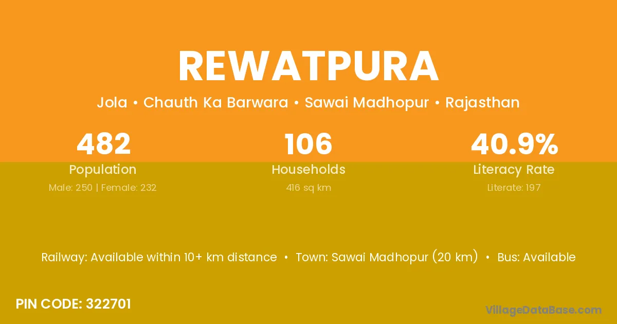 Rewatpura village has a total population of 482 people, of which 250 are males and 232 are females.