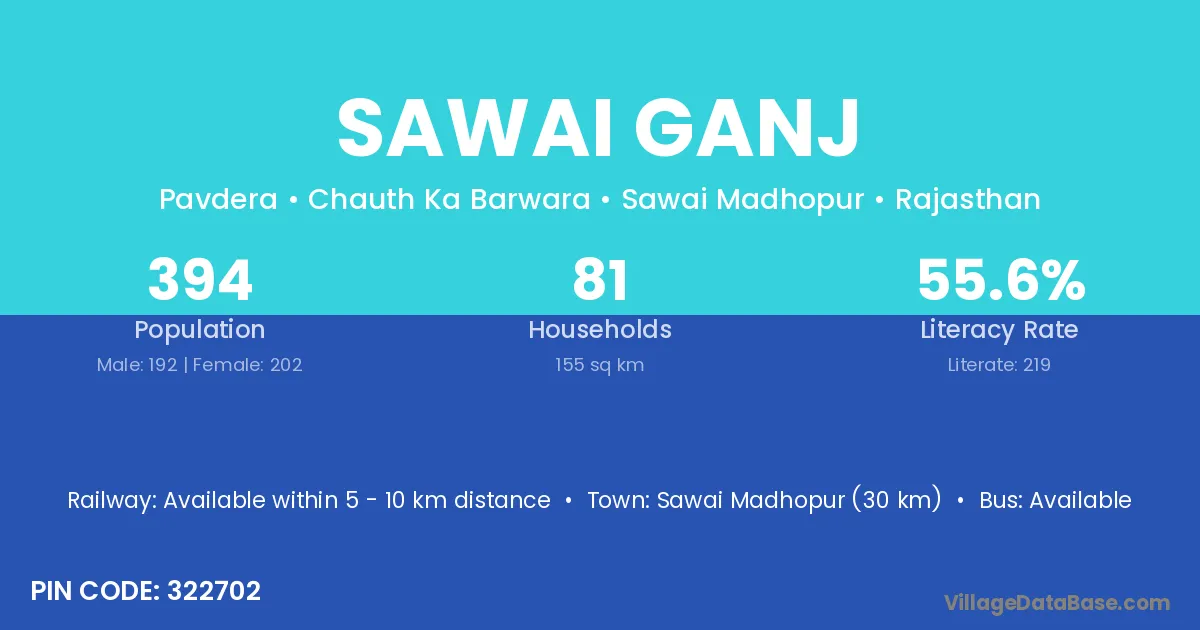 Sawai Madhopur (30 km) is the nearest town to Sawai Ganj village for major economic activities and is located approximately 30 km away.
