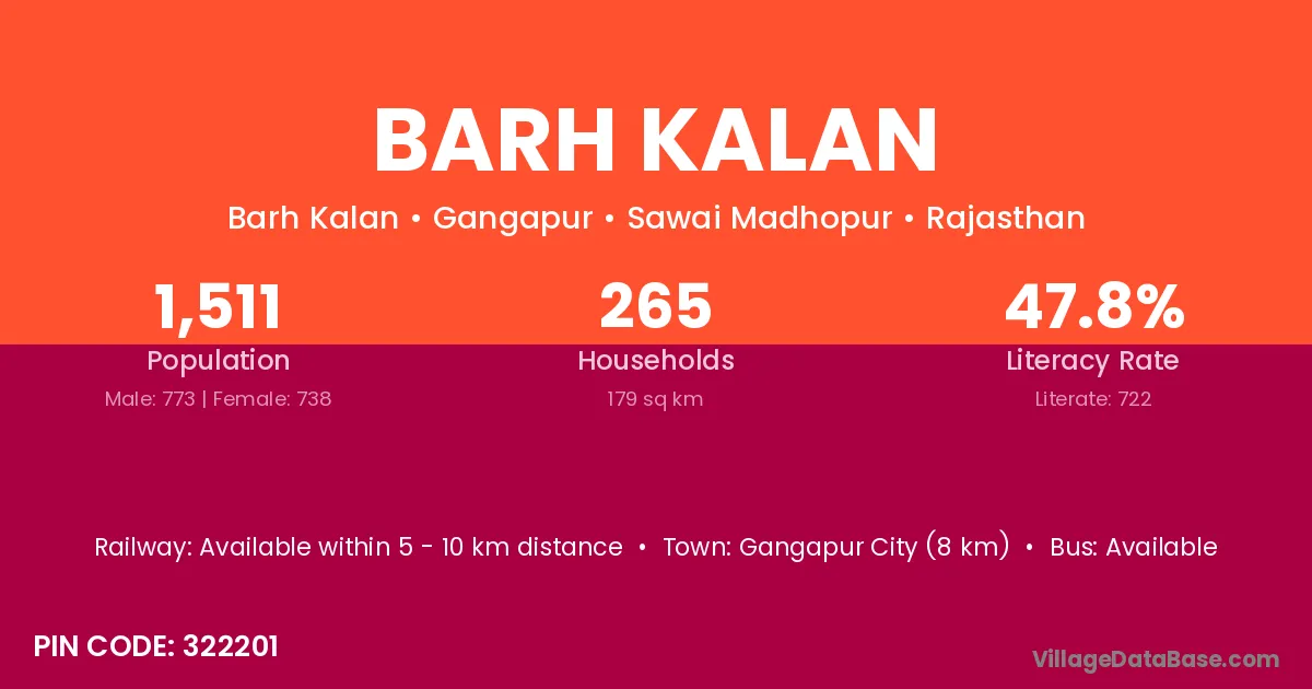 Gangapur City (8 km) is the nearest town to Barh Kalan village for major economic activities and is located approximately 8 km away.