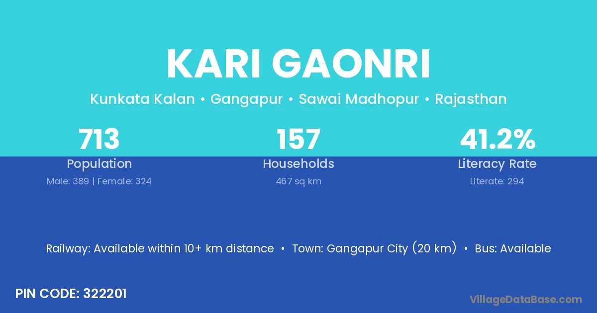 Gangapur City (20 km) is the nearest town to Kari Gaonri village for major economic activities and is located approximately 20 km away.