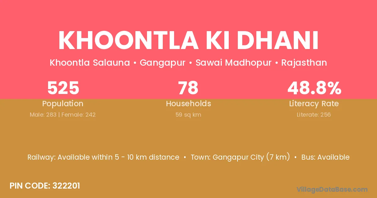Khoontla Ki Dhani village has a total population of 525 people, of which 283 are males and 242 are females.