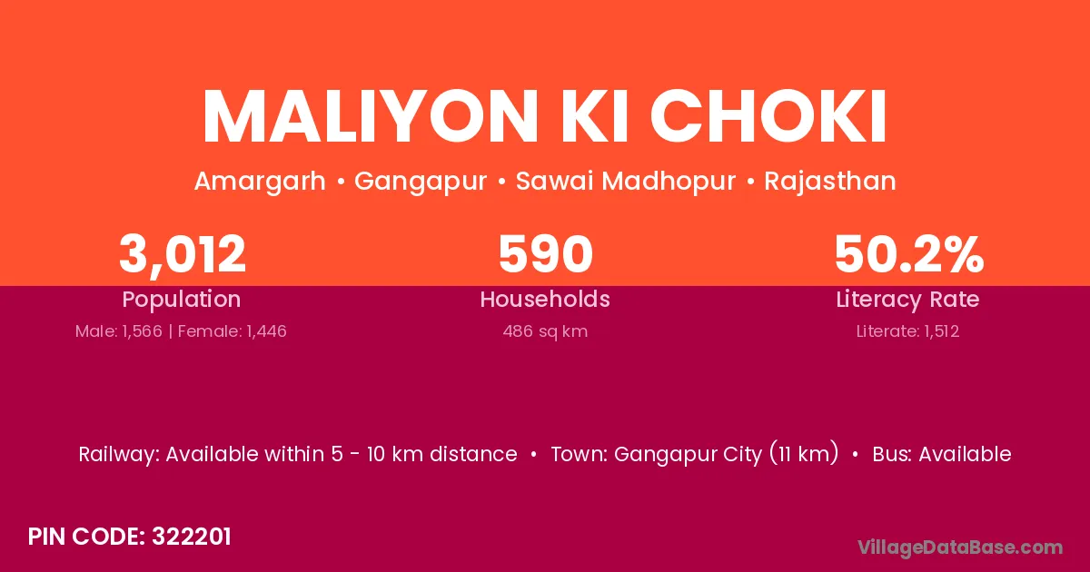 Gangapur City (11 km) is the nearest town to Maliyon Ki Choki village for major economic activities and is located approximately 11 km away.