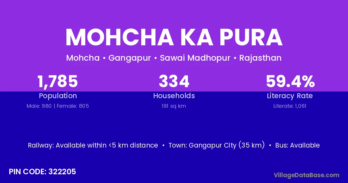 Gangapur City (35 km) is the nearest town to Mohcha Ka Pura village for major economic activities and is located approximately 35 km away.