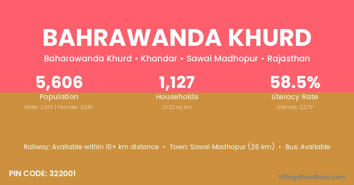 Sawai Madhopur (26 km) is the nearest town to Bahrawanda Khurd village for major economic activities and is located approximately 26 km away.