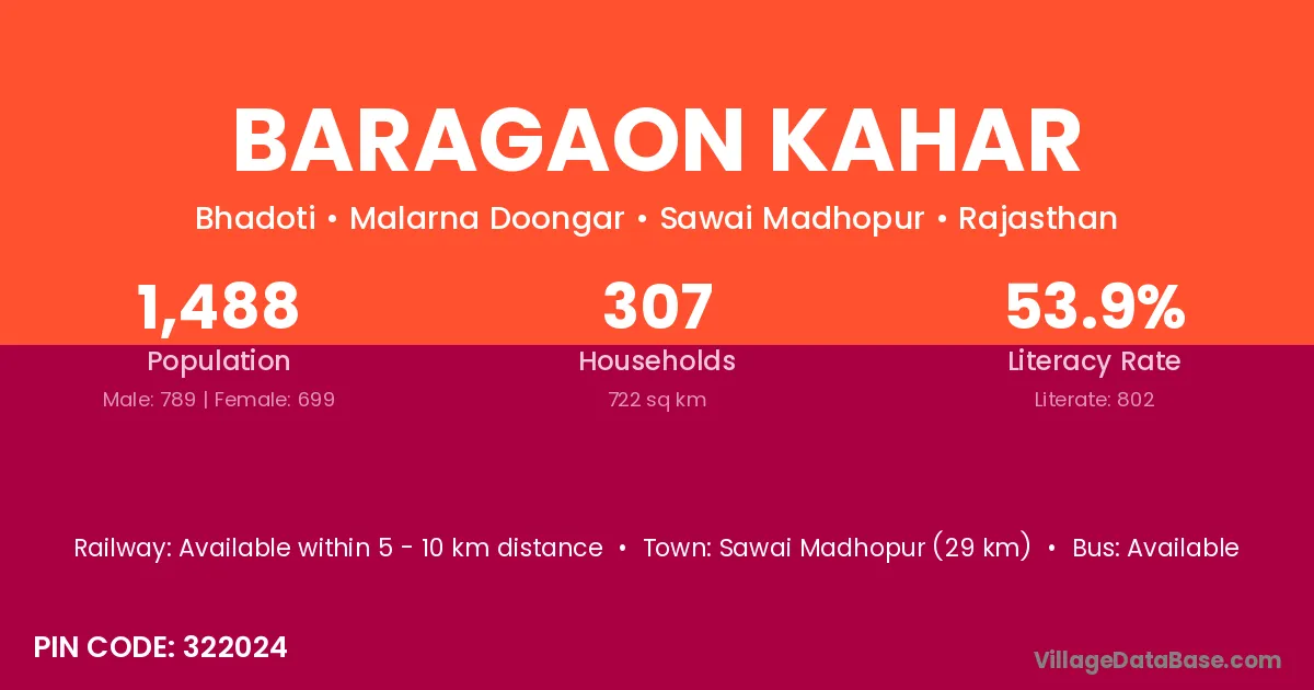 Sawai Madhopur (29 km) is the nearest town to Baragaon Kahar village for major economic activities and is located approximately 29 km away.