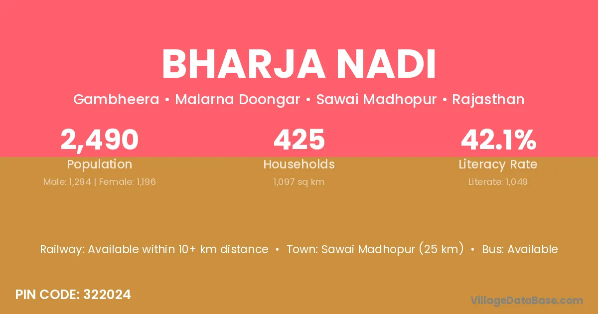 Sawai Madhopur (25 km) is the nearest town to Bharja Nadi village for major economic activities and is located approximately 25 km away.