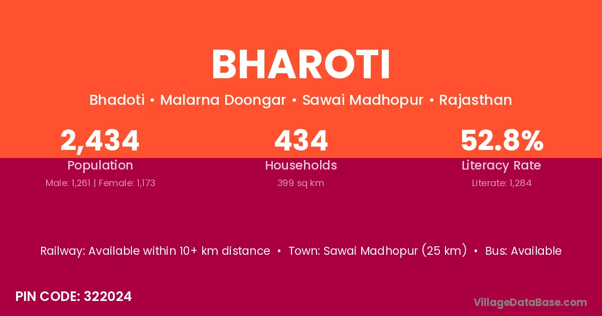 Sawai Madhopur (25 km) is the nearest town to Bharoti village for major economic activities and is located approximately 25 km away.