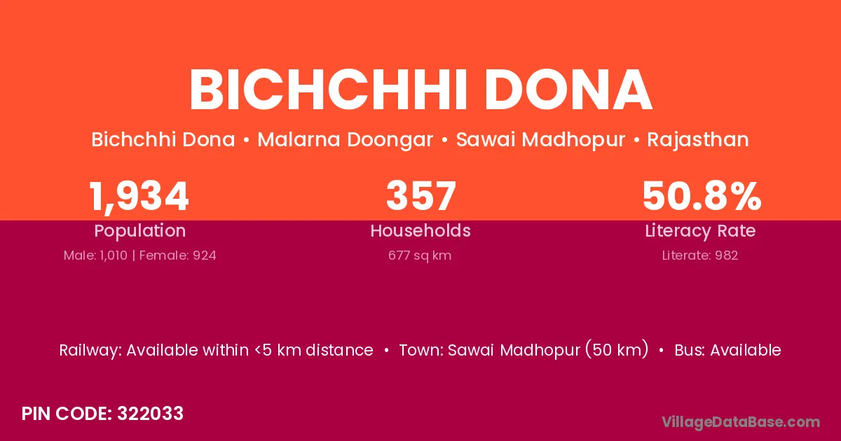 Sawai Madhopur (50 km) is the nearest town to Bichchhi Dona village for major economic activities and is located approximately 50 km away.