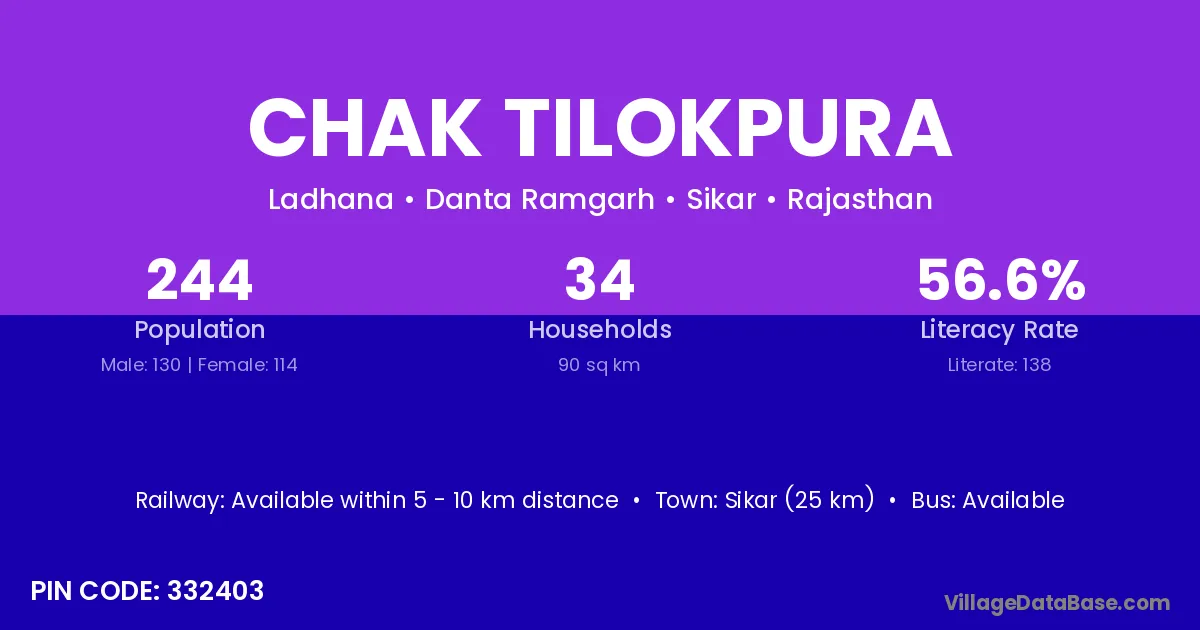 Sikar (25 km) is the nearest town to Chak Tilokpura village for major economic activities and is located approximately 25 km away.