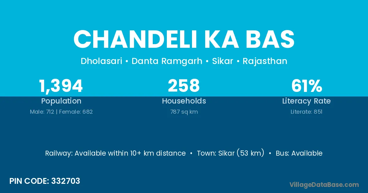 Chandeli Ka Bas village has a total population of 1,394 people, of which 712 are males and 682 are females.