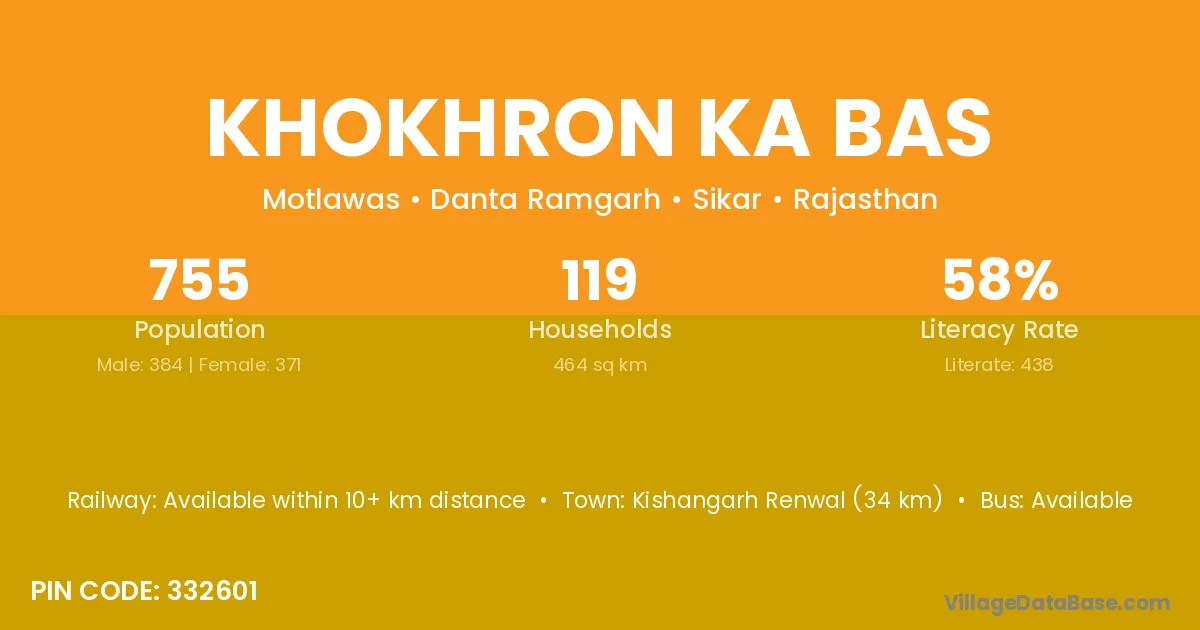 Khokhron Ka Bas village has a total population of 755 people, of which 384 are males and 371 are females.
