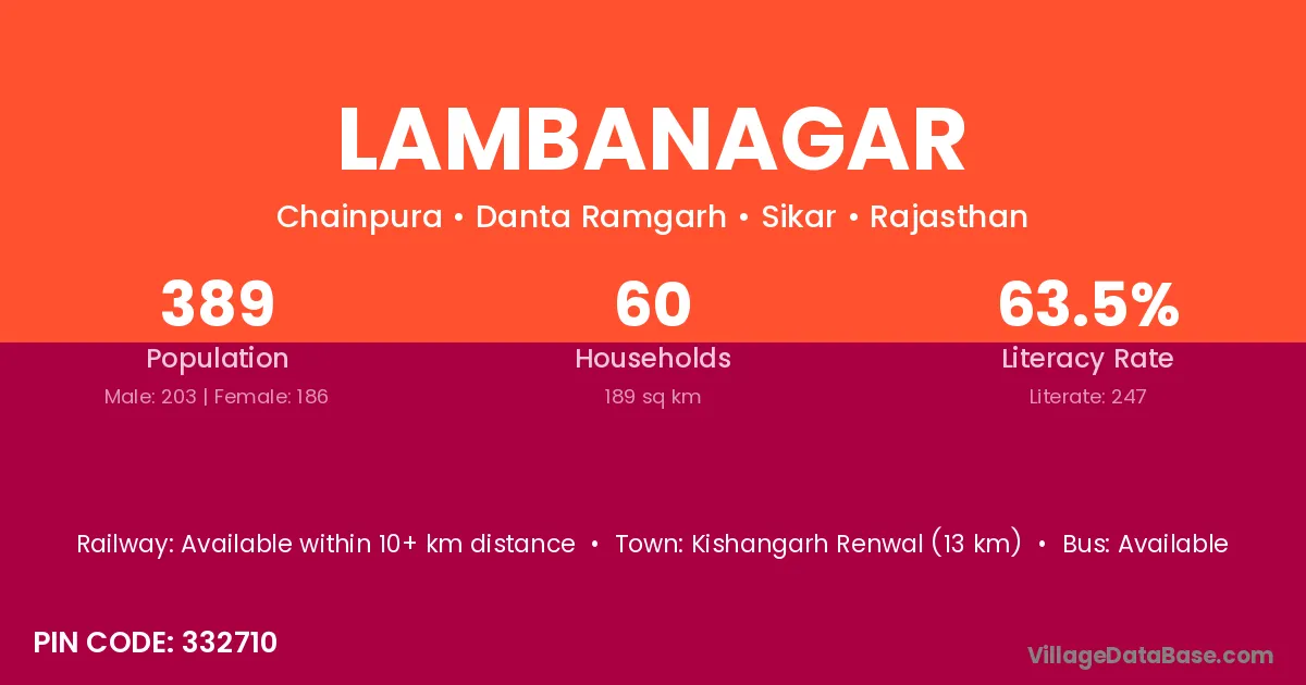 Lambanagar village has a total population of 389 people, of which 203 are males and 186 are females.