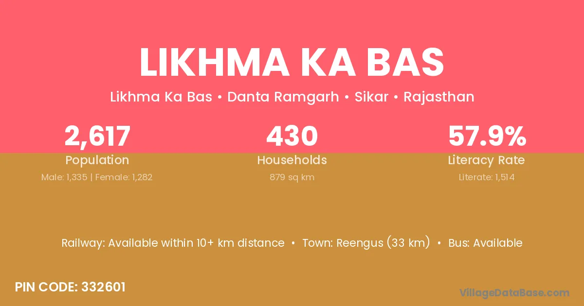 Likhma Ka Bas village has a total population of 2,617 people, of which 1,335 are males and 1,282 are females.