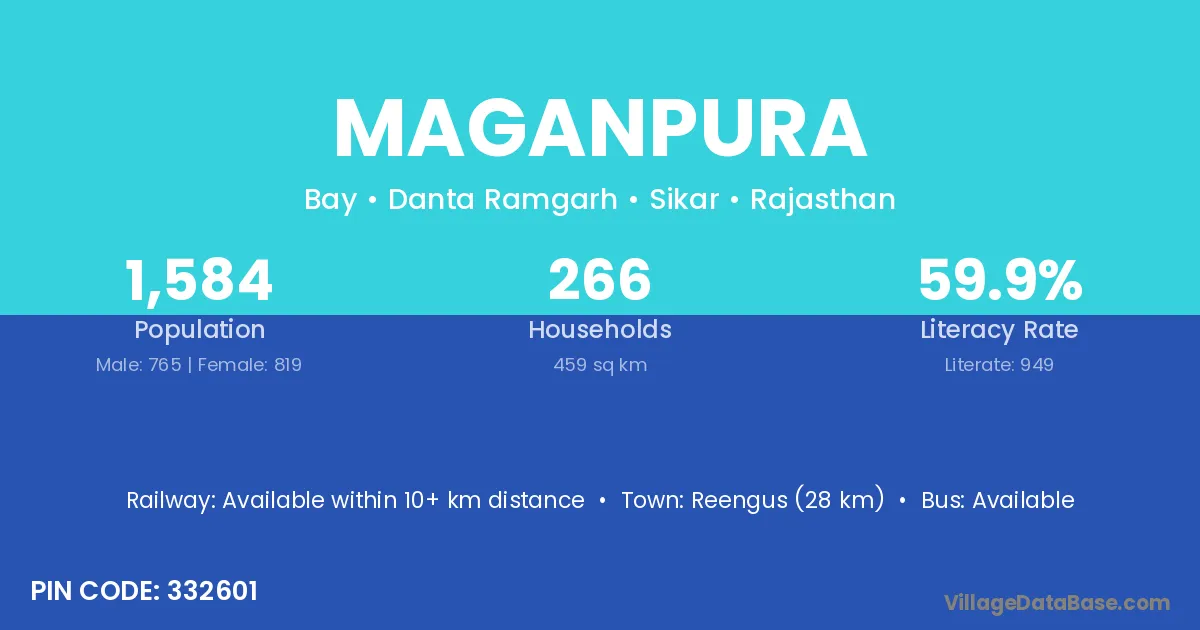 Reengus (28 km) is the nearest town to Maganpura village for major economic activities and is located approximately 28 km away.