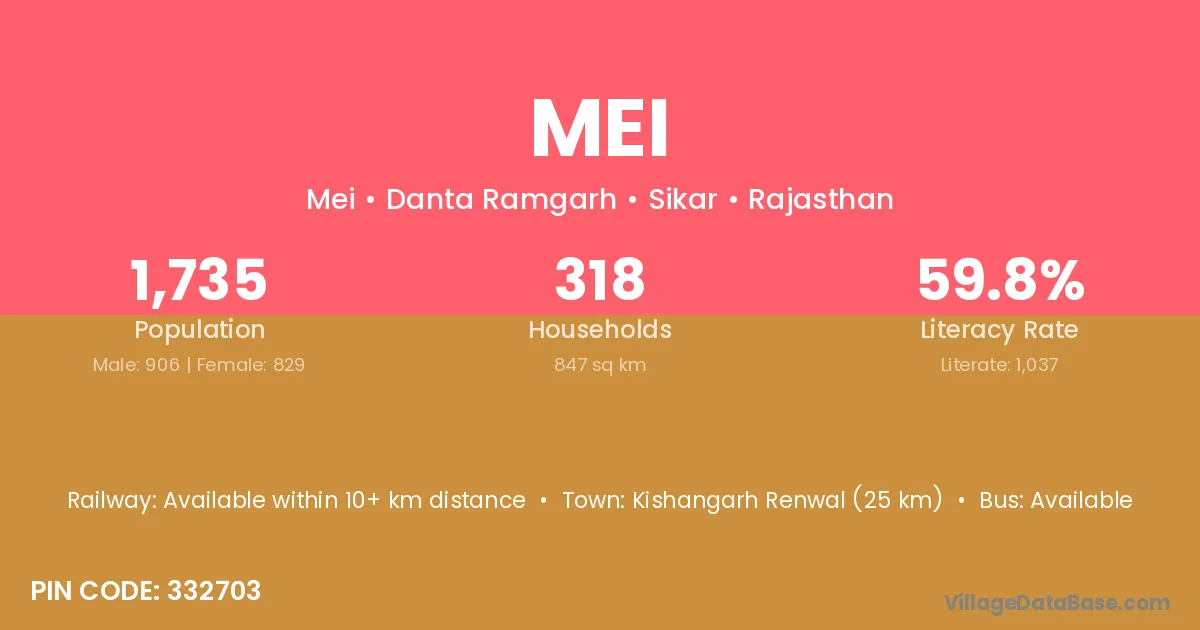 Kishangarh Renwal (25 km) is the nearest town to Mei village for major economic activities and is located approximately 25 km away.