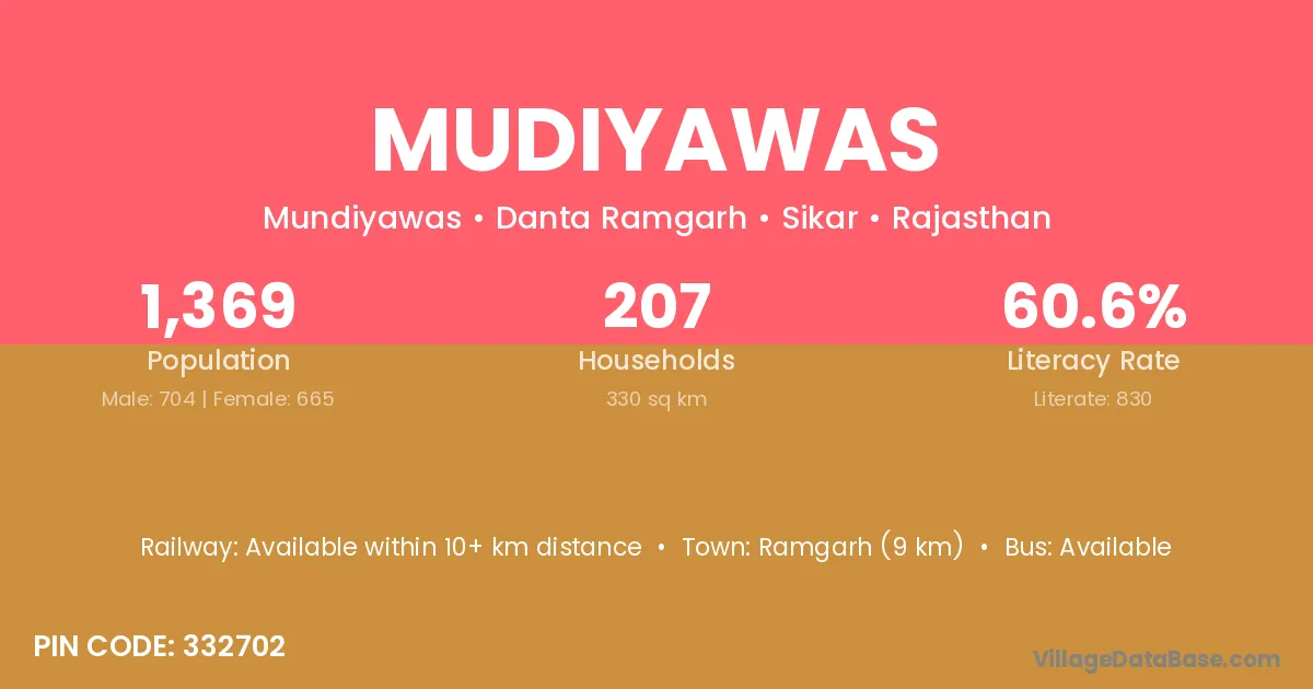Ramgarh (9 km) is the nearest town to Mudiyawas village for major economic activities and is located approximately 9 km away.